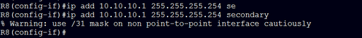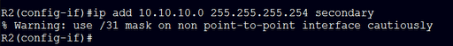 Ping works as expected…. so why the warning and why haven’t I seen this configured before. Clearly this uses less address space over the /30. After all.. who needs a broadcast on a point to point network anyways? Maybe it’s required, I’ll have to look into that…